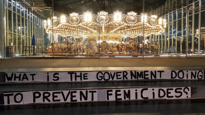 Vista de un cartel con la pregunta "¿Qué está haciendo el Gobierno para prevenir los feminicidios?", pegado por un grupo de activistas y seguidoras del colectivo "Feminist Collages Nueva York", el 21 de noviembre de 2021, en las escaleras del Tiovivo de Jane en el barrio de Dumbo en Brooklyn, Nueva York (EE.UU.). (Foto: EFE/Jorge Fuentelsaz)