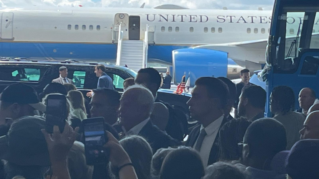 On Sunday, Harris and Walz arrived with their spouses at Pittsburgh International Airport, where they held hands and raised their arms together in front of cheering supporters. The foursome then set off on their bus to glad-hand with voters in the Pittsburgh area.