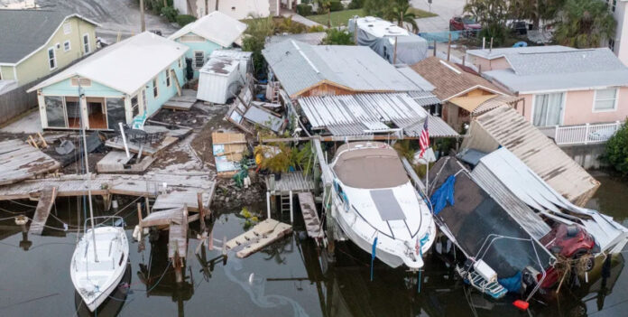 Esta imagen aérea tomada con dron muestra casas dañadas y un vehículo caído al agua tras la marejada ciclónica provocada por el huracán Helene, el sábado 28 de septiembre de 2024 en Madeira Beach, Florida. (Foto: Luis Santana/Tampa Bay Times)
