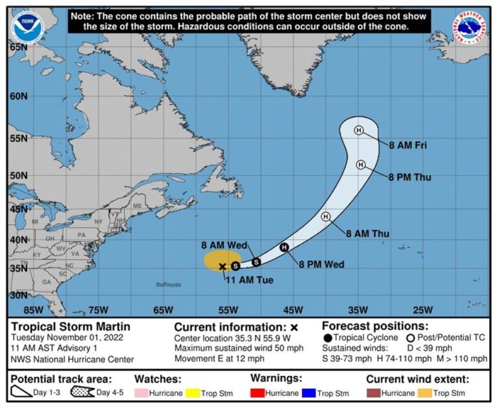 En cuanto a Martin, sus vientos alcanzan las 65 millas por hora (100 km/h) y se mueve a 15 millas por hora (24 km/h) lejos de la costa.