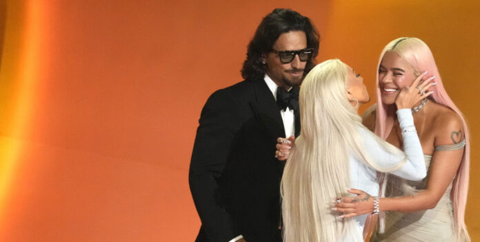 Karol G subió al escenario de la Arena Crypto.com durante la ceremonia televisada tras ser anunciada por Maluma y Christina Aguilera como la ganadora de la categoría de mejor álbum de música urbana, en la que competía con Rauw Alejandro por “Saturno” y Tainy por “Data”.