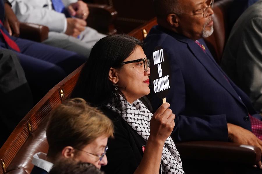 La congresista demócrata de origen palestino Rashida Tlaib llevó durante el discurso del primer ministro israelí, Benjamín Netanyahu, un abanico en el que ponía «criminal de guerra» en señal de protesta.