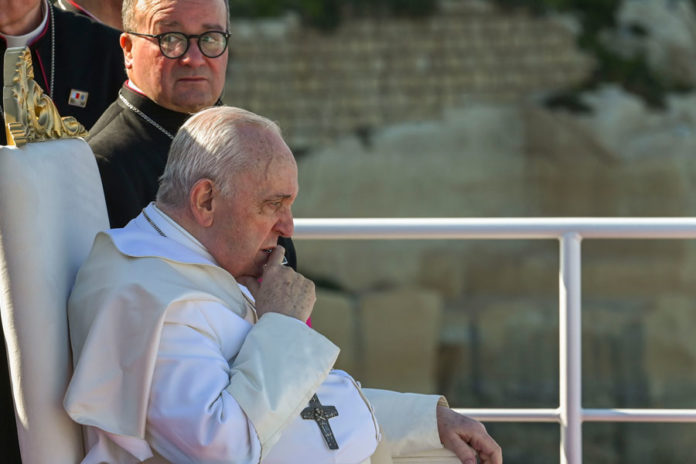 Francisco agregó que la guerra había lastimado tanto su corazón que a veces olvida el dolor de sus rodillas. El pontífice lleva meses sufriendo por una distensión de ligamento en su rodilla derecha. La inflamación llegó a tal nivel que el Vaticano usó un elevador para que pudiera subir y bajar del avión el sábado en el vuelo a Malta.