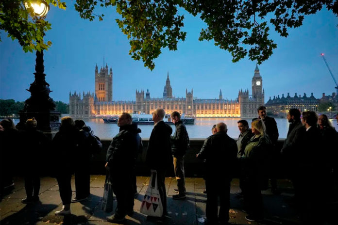 La fila para ver a la reina en cuerpo presente se extendía el jueves por la mañana 5,6 kilómetros (3,5 millas) hasta el Puente de la Torre. Recorría la orilla sur del río Támesis, y después cruzaba por un puente hasta el Parlamento. Miles de personas aguardaban sin importar las horas de espera.