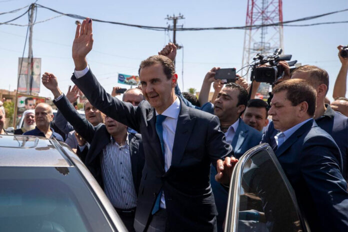 El presidente sirio Bashar Assad saluda a sus partidarios en una casilla electoral en Douma, cerca de Damasco, Siria, 26 de mayo de 2021. La justicia francesa emitió órdenes de arresto por crímenes de guerra para Assad, su hermano Maher y dos generales sirios el miércoles 15 de noviembre de 2023. (Foto: AP/Hassan Ammar/File)