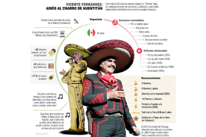 Vicente Fernández Gómez, conocido como el «Charro de Huentitán» o «el Sinatra de las rancheras», falleció en su tierra, a los 81 años, tras un largo período hospitalizado en la ciudad de Guadalajara.