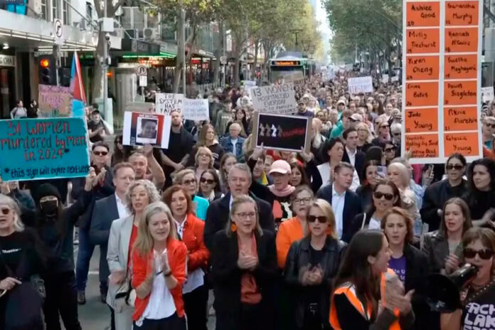 Miles de personas se manifestaron el domingo en ciudades de Australia para atraer atención a los fallecimientos de 27 mujeres en lo que va del año, presuntamente por actos de violencia de género en una población de 27 millones.
