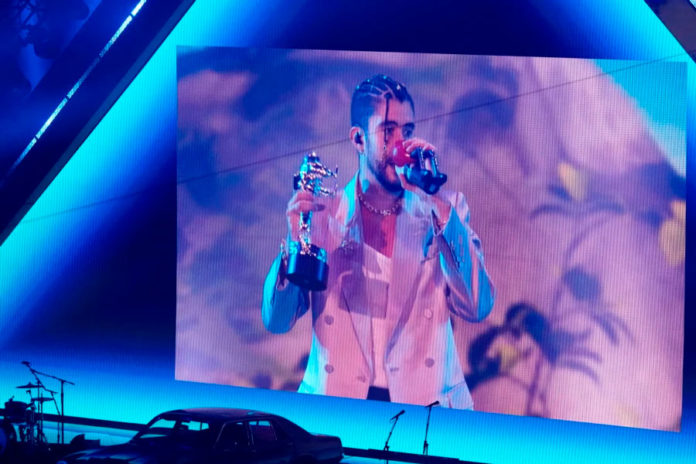 Bad Bunny recibe de forma remota el premio al artista del año en los Premios MTV a los Videos Musicales en el Prudential Center el domingo 28 de agosto de 2022 en Newark, Nueva Jersey. (Foto: AP/Charles Sykes/Invision)