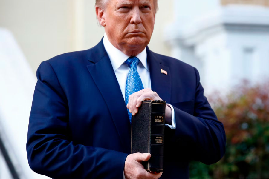 El entonces presidente Donald Trump sostiene una Biblia mientras visita las afueras de la Iglesia de San Juan, frente al Parque Lafayette, desde la Casa Blanca, el 1 de junio de 2020, en Washington. (Foto: VOA)