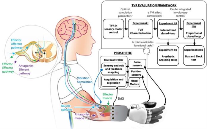 Los científicos han encontrado la forma de controlar la contribución de los reflejos espinales en el control neuronal de una prótesis de mano, y para conseguirlo proponen el uso de la estimulación nerviosa mediante la vibración localizada de los tendones asociados con la tarea motora que se quiere realizar.