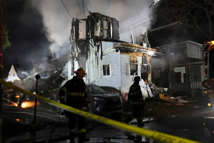 Authorities believe the home was set on fire by someone inside. Intense flames were initially seen rising from the roof and top floor of the three-story home before spreading to the lower levels, largely gutting the structure.