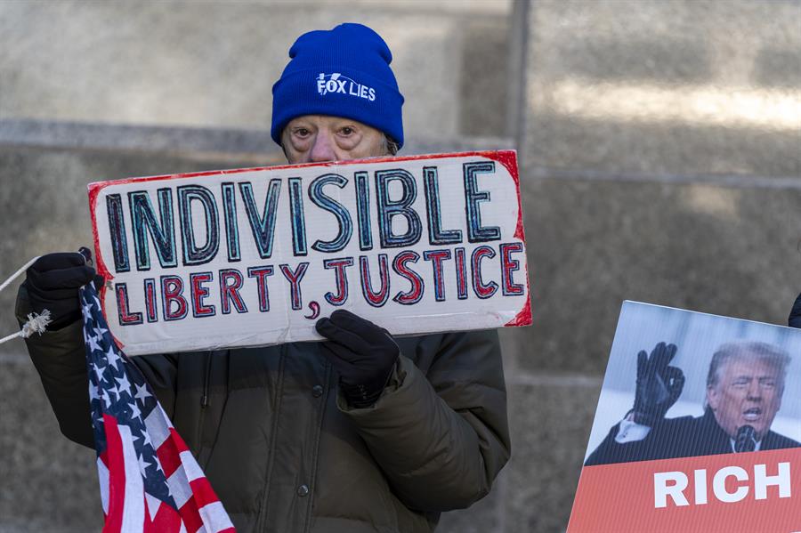 A las afueras del tribunal, en esta mañana gélida de enero, dos grupos de simpatizantes y de opositores a Trump aparecieron a primera hora con pancartas, pese a que se sabía que el republicano no acudiría a la vista.