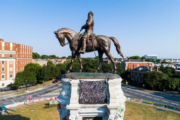 Una imagen de archivo tomada con un dron muestra una estatua del general confederado Robert E. Lee en Monument Avenue en Richmond, Virginia, EE. UU.. (Foto: EFE/JIM LO SCALZO)