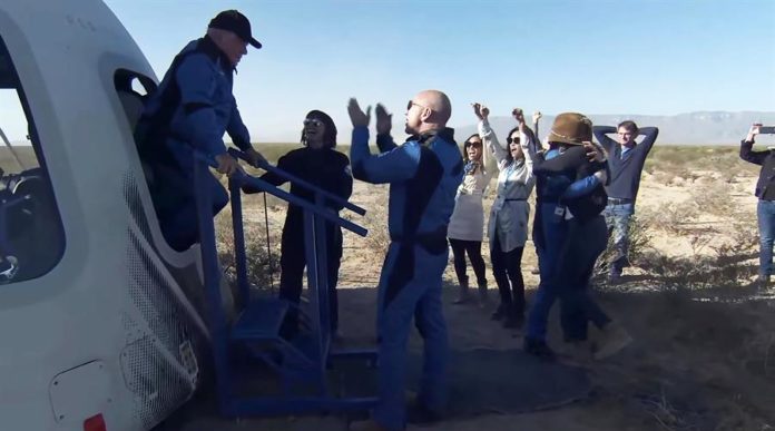 Fuera de la cápsula les esperaba Bezos, que recibió uno por uno a los turistas espaciales con un abrazo, conforme fueron saliendo de la cápsula.