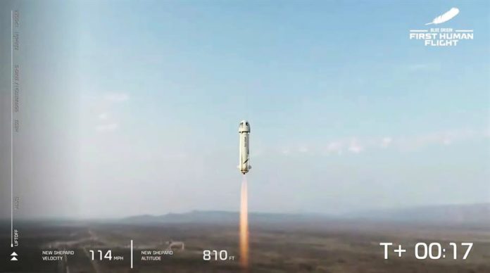 El cohete New Shepard, llamado así en honor a Alan Shepard, el primer estadounidense en el espacio, despegó sobre las 8.12 horas locales (13.12 horas GMT), con pocos minutos de retraso de la hora prevista, desde una base levantada en medio del desierto y cerca de la localidad Van Horn.