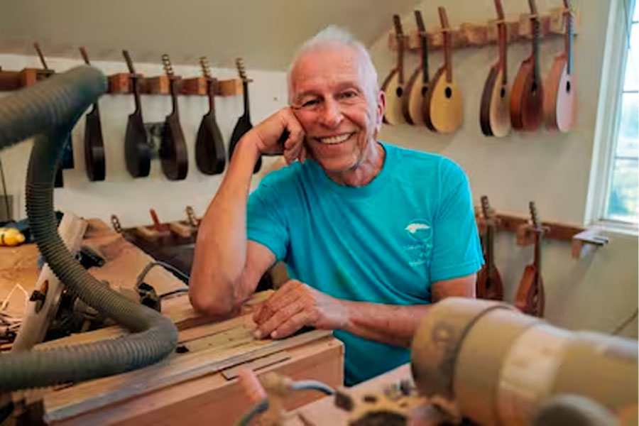 Encuentra una satisfacción similar en su taller de dos pisos, donde fabrica la más reciente de las miles de mandolinas que ha producido a lo largo de décadas, lo que ha permitido a la gente “compartir la alegría de la música”.