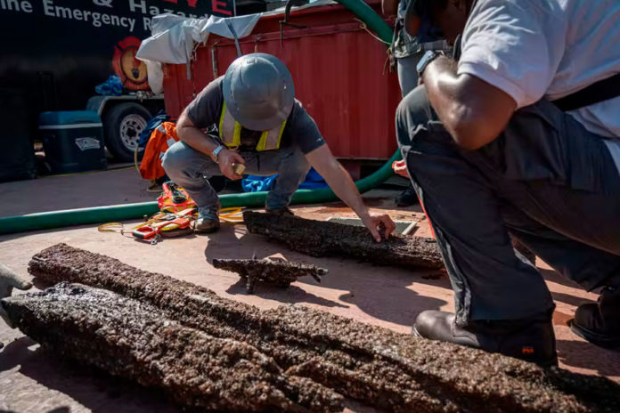 Usando una barcaza con una grúa, los buzos exploraron este mes durante diez días las aguas turbias para ver el estado de la embarcación, que recién en el 2019 fue identificada como el Clotilda. Extrajeron algunos pedazos de madera de 27 metros (90 pies) de largo para analizarlos y documentarlos.