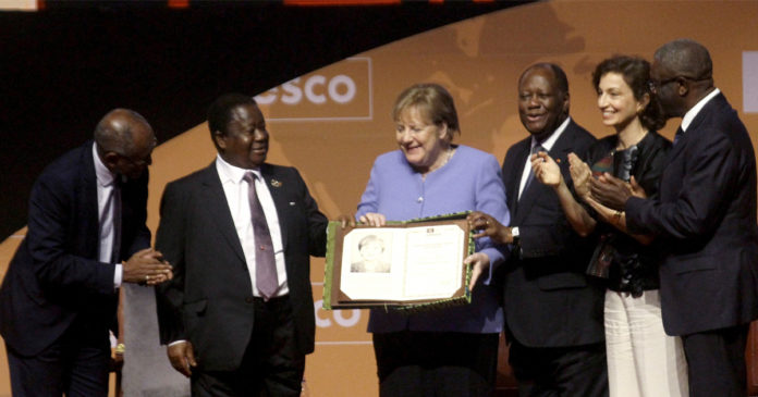 YAMOUSSOUKRO, Costa de Marfil.— La excanciller alemana Angela Merkel recibió un premio de la paz de la UNESCO el miércoles por su decisión de permitir el ingreso de 1,2 millones de migrantes a Alemania a pesar de la resistencia tanto en el país como de sus socios europeos.