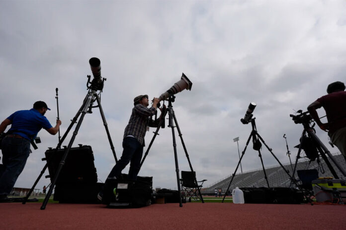 Fotógrafos preparan sus equipos para capturar un eclipse solar total en Eagle Pass, Texas, el lunes 8 de abril de 2024. (Foto: AP/Eric Gay)