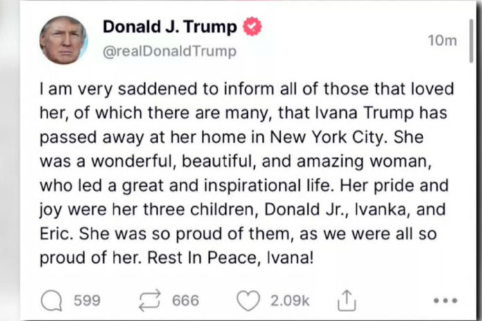 «Estoy triste de informar a quienes la amaban, que son muchos, que Ivana Trump ha fallecido en su casa de la ciudad de Nueva York», dijo Trump, que se divorció de la exmodelo en 1992, en su cuenta de Truth Social.