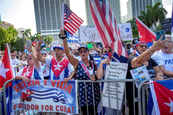 Miami, EE.UU.- Bajo el lema «Abajo las cadenas», miles de personas se concentraron este sábado en Miami para pedir libertad para Cuba, Nicaragua y Venezuela y solidaridad internacional con las personas que son reprimidas por oponerse a las «dictaduras».