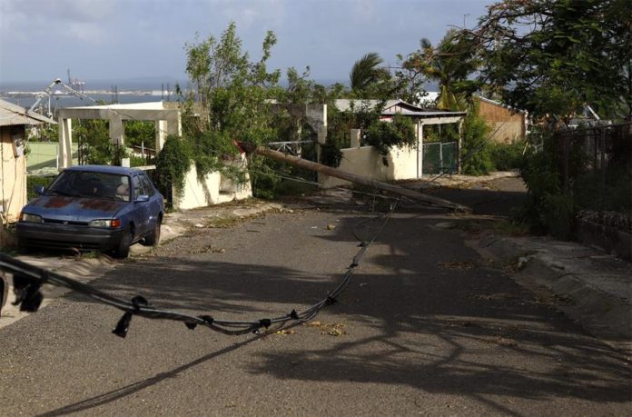 Fotografía de este miércoles donde se muestra a unos postes de electricidad caídos sobre una casa por el paso del huracán Fiona por el barrio Punta Diamante en Ponce, Puerto Rico. (Foto: EFE/Thais Llorca)