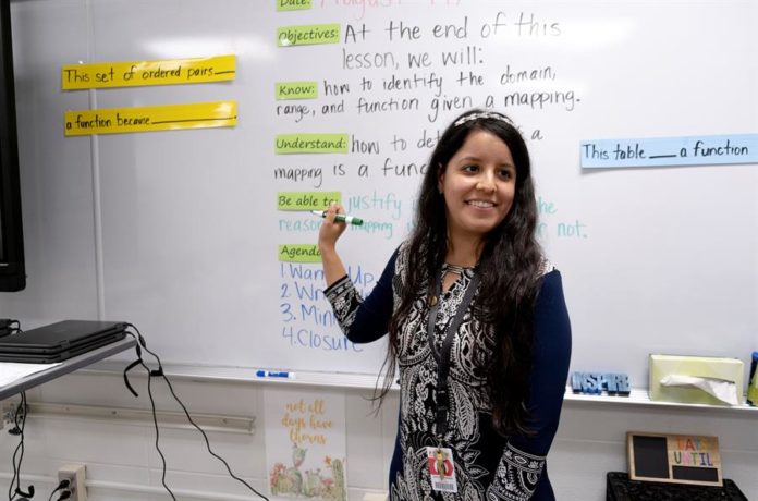Fotografía de archivo que muestra a la maestra Jeanette Robledo impartiendo una clase a sus alumnos en la secundaria La Promesa, un nuevo plantel del Distrito Escolar Independiente de Aldine, en Houston (Texas). (Foto: EFE/José Luis Castillo)