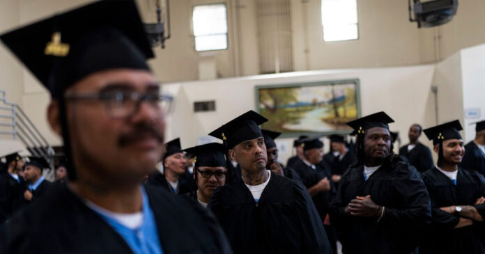 For these were no ordinary graduates. Their black commencement garb almost hid their aqua and navy-blue prison uniforms as they received college degrees, high school diplomas and vocational certificates earned while they served time.