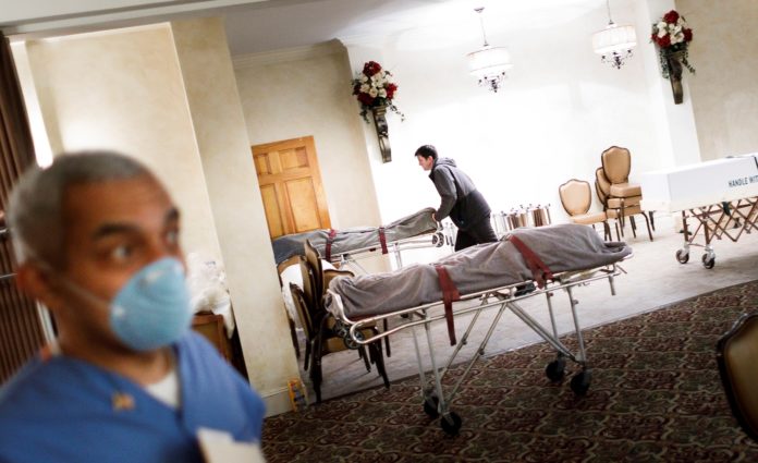 El director de funerales Joe Nuefeld Jr. (R) transfiere uno de los muchos cuerpos que maneja la casa, ya sea para entierro o cremación, con el director de funerales Omar Rodríguez (L) en primer plano, en la funeraria Gerald J. Neufeld en el vecindario de Elmhurst de Queens, Nueva York, EE. UU., 24 de abril de 2020. EFE / EPA / JUSTIN LANE