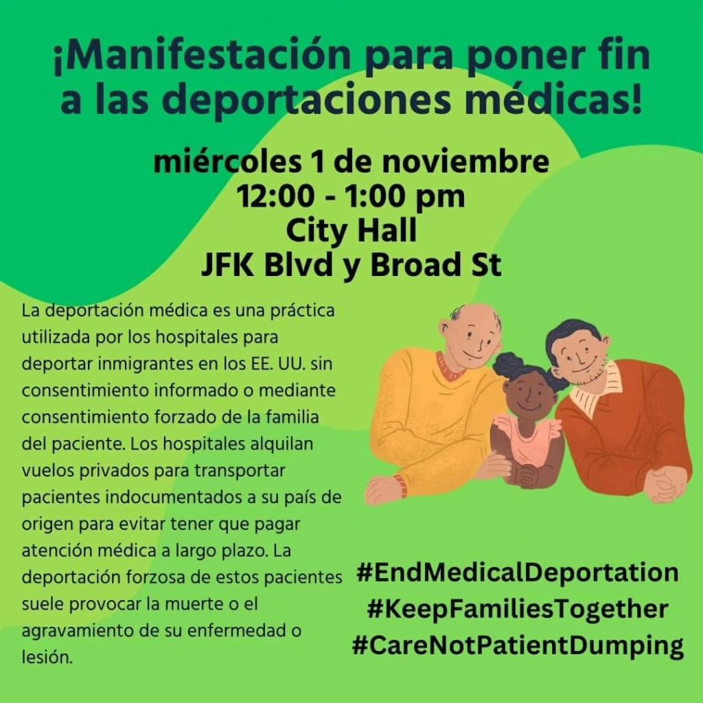 La deportación médica es una práctica utilizada por los hospitales para deportar inmigrantes en los EE. UU. sin consentimiento informado o mediante consentimiento forzado de la familia del paciente. Los hospitales alquilan vuelos privados para transportar pacientes indocumentados a su país de origen para evitar tener que pagar atención médica a largo plazo, provocando a menudo el agravamiento de la enfermedad o la muerte de estos pacientes. City Hall, JFH Blvd y Broad Street. Miércoles 1 de noviembre, 12:00 a 1:00 pm.