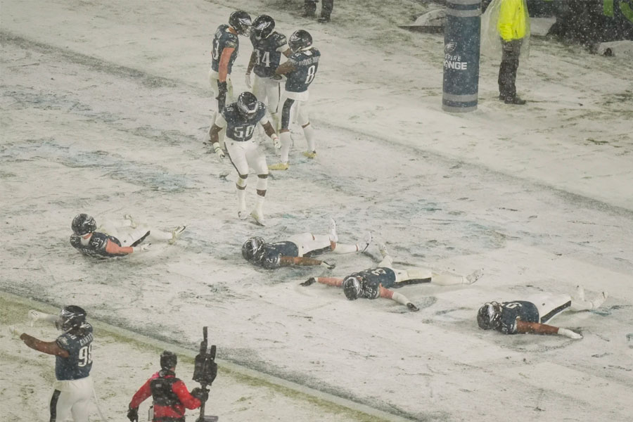 Eagles defenders frolicked in the winter mess and made snow angels in the end zone to celebrate the turnovers. Some brave frigid fans went shirtless — and yes, even Santa Claus was in the house, without a report of any snowball throwing.