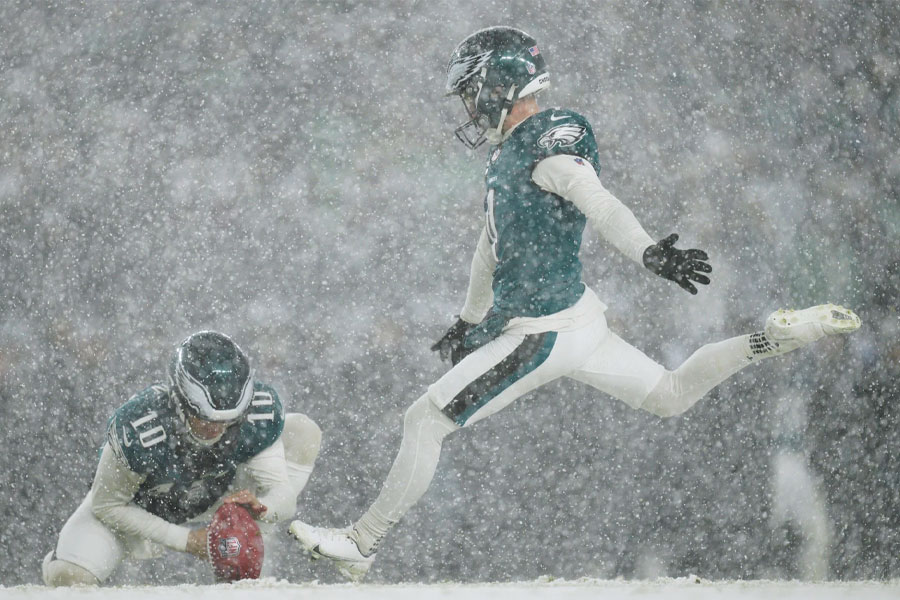 Stadium workers used snow blowers to clear yard lines and hash marks, while Eagles scooped and kicked away snow to clear a circle for Elliott’s field goal attempts.
