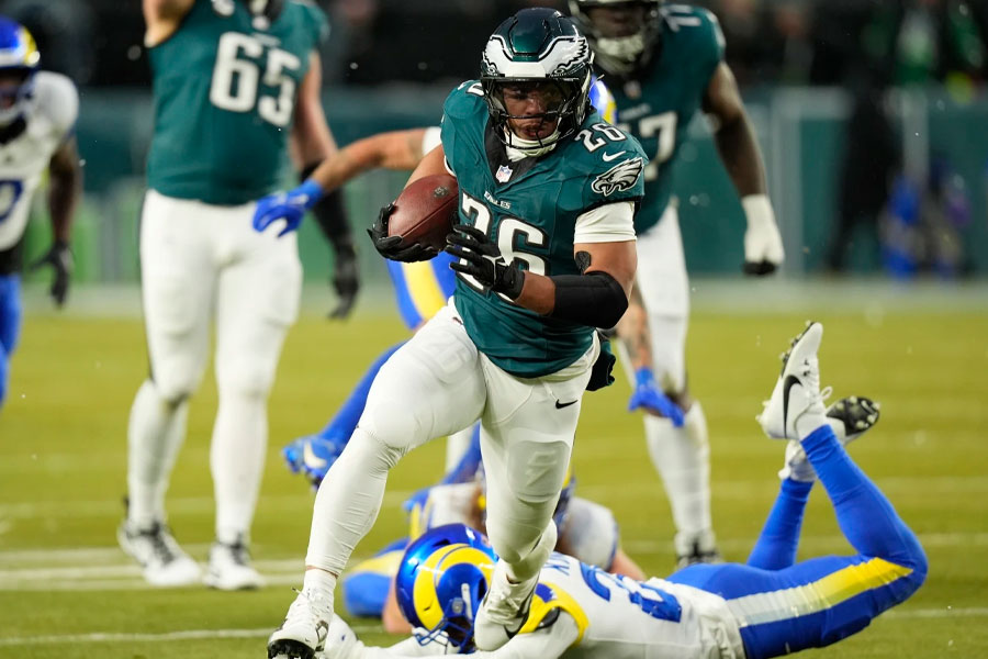 PHILADELPHIA.— Saquon Barkley blew through a hole and ran untouched in the wintry mix, the Eagles‘ 2,000-yard rusher smacking his helmet with his hand on his final snowy steps of a 78-yard touchdown run.
