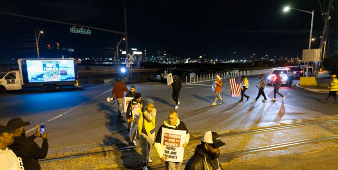 Los trabajadores comenzaron a hacer piquetes en el puerto de Filadelfia poco después de la medianoche, caminando en círculos en un cruce ferroviario en el exterior del puerto y coreando “Sin un contrato justo no habrá trabajo”.