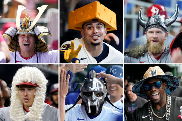 Change can be good. Miami’s homer party has morphed from a simple chain with a massive Marlins logo to a full-on ensemble that now includes a giant straw hat and a pair of sunglasses, a nod to a city that’s part neon glam, part retirement community.