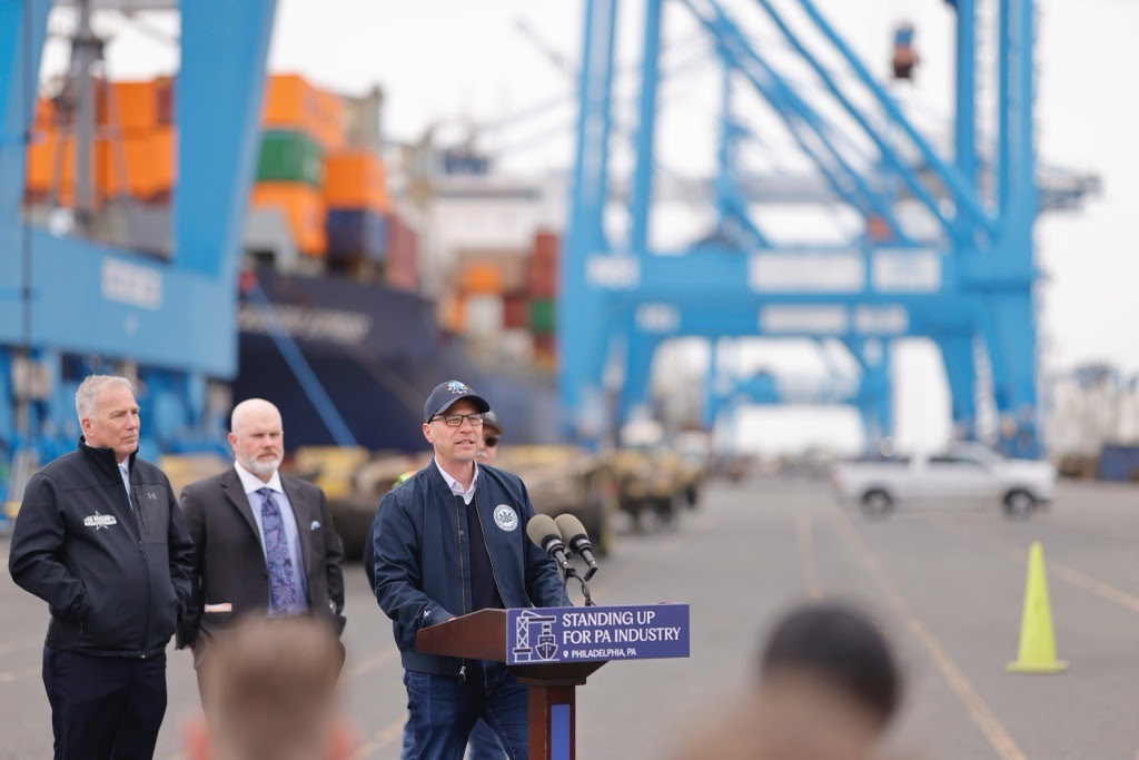 Governor Shapiro was joined by Michael Pearson, Chairman of PhilaPort; Leo Holt, President of Holt Logistics; Representative Ed Neilson; and Daniel Duffy, a crane operator with 27 years of experience at PhilaPort and a member of the International Longshoremen’s Association (ILA) Local 1291. For Duffy, the rising tariffs are not just abstract policies — they directly affect their jobs and their families.
