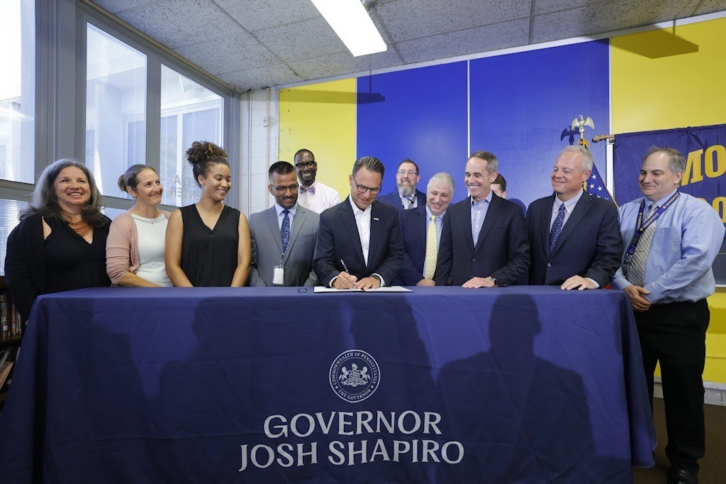 The Governor was joined for a ceremonial bill signing by Morrisville Borough School District Superintendent Dr. Andrew Doster, Morrisville Middle/Senior High School teacher Elizabeth Glaum-Lathbury and student Laila Waters, as well as local and state legislators.