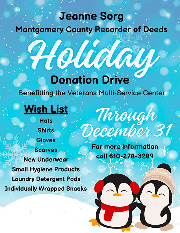 NORRISTOWN, PA – Jeanne Sorg, Montgomery County Recorder of Deeds is holding her annual holiday donation drive to benefit the Veteran’s Multi-Service Center (VMC). The VMC helps veterans who are homeless or at risk of homelessness access services and benefits. The donation drive will run through the end of December and items can be dropped off at the Recorder of Deeds office at One Montgomery Plaza in Norristown.