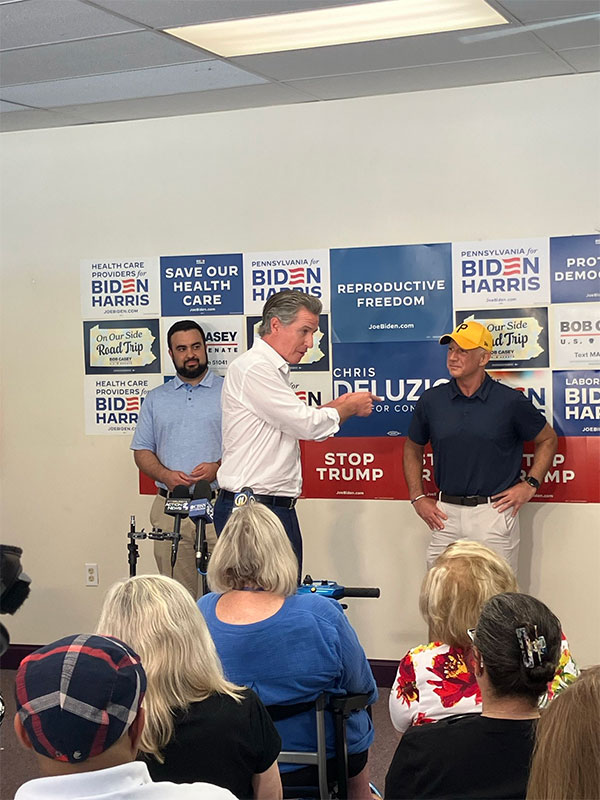 El gobernador de California, Gavin Newsom, viajó al otro extremo de su estado e hizo campaña a favor de Biden-Harris en Doylestown, condado de Bucks. “Trump es una clara amenaza para nuestra democracia, ya que prometió ser un dictador desde el ‘primer día’ si es reelegido, y advirtió sobre un ‘baño de sangre’ si no gana”. Señaló el apoyo republicano a la agenda extrema del Proyecto 2025, “que incluye convertir al Departamento de Justicia en un arma contra sus enemigos políticos”, y agregó: “La tasa de asesinatos y de delitos violentos ha disminuido cada año desde Biden. Se disparó por las nubes bajo Donald Trump. Aumento del 30% en asesinatos en 2020, ¿y está hablando del historial del Partido Demócrata y de Biden en materia de crimen y violencia? ¡Somos nosotros los que lo precipitamos!