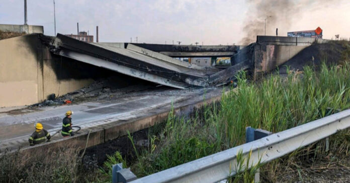 PHILADELPHIA.— An elevated section of Interstate 95 collapsed early Sunday in Philadelphia after a tanker truck carrying flammable cargo caught fire, closing a heavily traveled segment of the East Coast’s main north-south highway indefinitely, authorities said.