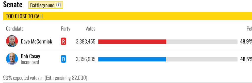 Casey no ha concedido una derrota y, aunque los republicanos lo presionan en las redes sociales, su director de campaña dijo en un comunicado el miércoles que «McCormick y sus aliados están tratando de privar de sus derechos a los votantes de Pensilvania».