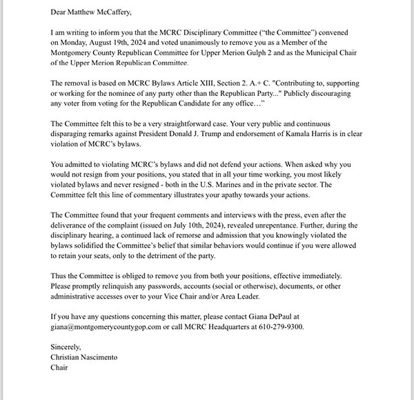 El Comité Republicano del Condado de Montgomery tomó medidas disciplinarias contra McCaffery, ya que su apoyo público al candidato del partido de la oposición viola sus estatutos.