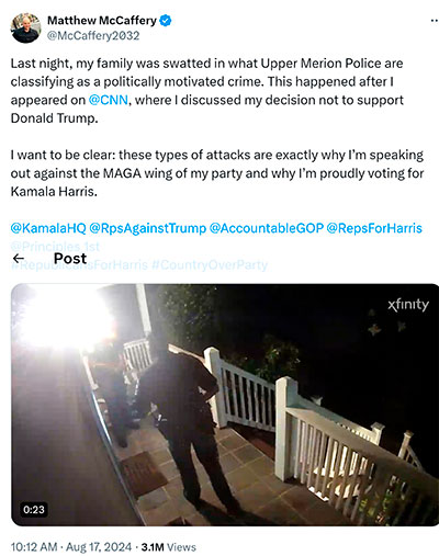 UPPER MERION, PA — Un funcionario republicano del condado de Montgomery dijo que fue «swatted» debido a su reciente apoyo público a la candidata presidencial demócrata Kamala Harris.