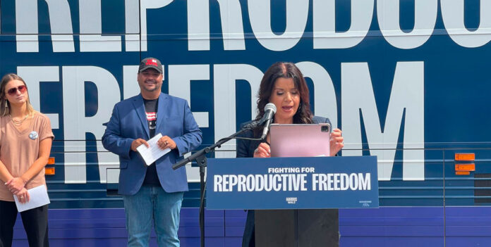 La estratega política republicana fue presentada en Fountain Park, Allentown, durante una parada de la gira nacional de autobuses Fighting for Reproductive Freedom de la campaña presidencial de Harris-Walz, por Víctor Martínez, propietario de la estación de radio La Mega de Allentown. En el evento, organizado para atraer el voto latino, también estuvo presente Hadley Duvall, sobreviviente de agresión sexual cuando era niña.