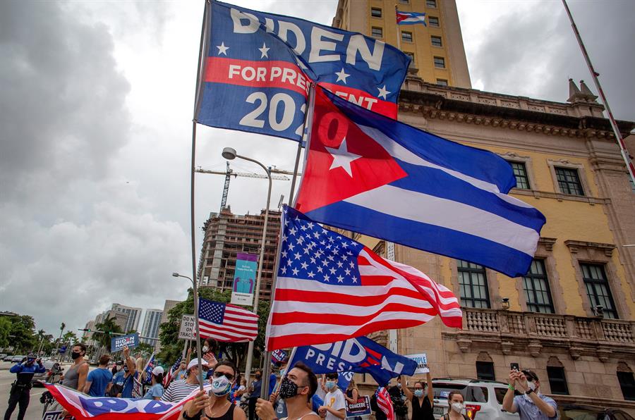 Hispanos del sur de Florida se congregaron este sábado en Miami para festejar a ritmo de salsa el triunfo del candidato demócrata, Joe Biden, después de varios días de angustia tras saber que su estado le había dado al presidente Donald Trump sus valiosos 29 votos en el Colegio Electoral.