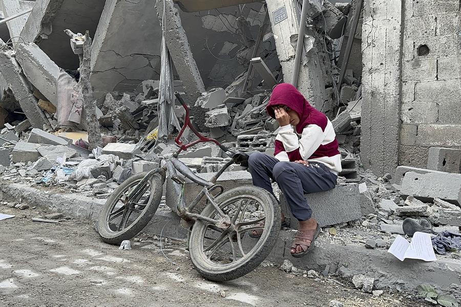 Un menor entre los escombros de un edificio bombardeado en Rafah, Palestina. (Foto: EFE/Str)