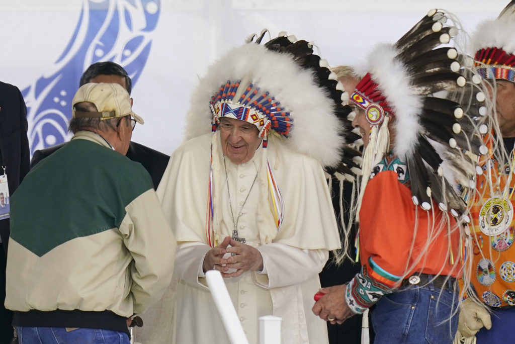 En el primer evento de su “peregrinación penitencial” de una semana de duración, el papa viajó a las tierras de cuatro naciones Cree para orar en un cementerio y luego ofrecer la tan buscada disculpa en los terrenos ceremoniales powow cercanos. Cuatro jefes acompañaron al pontífice hasta el lugar, cerca del exinternado Ermineskin para indígenas, y le entregaron un tocado de plumas después de su intervención.