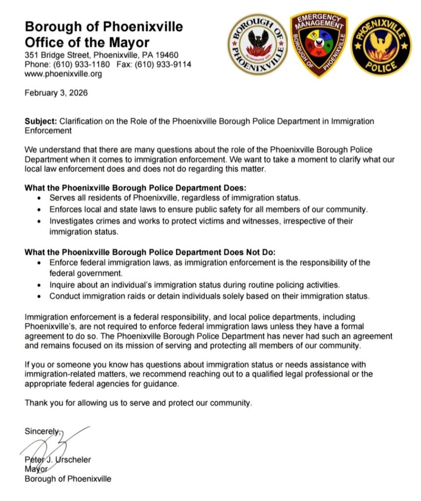 Ante la indignación generada por los videos, el alcalde de Phoenixville, Peter Urscheler, emitió un comunicado en el que destacó que la policía local no participa en operativos migratorios y que no existe ningún acuerdo que la obligue a hacerlo. Subrayó que la responsabilidad de hacer cumplir las leyes migratorias recae exclusivamente en las autoridades federales. Por su parte, la comisionada del condado de Chester, Marian Moskowitz, expresó su preocupación por el posible uso desproporcionado de fuerza y la aparente falta de supervisión en las acciones federales, señalando la necesidad de garantizar que los derechos civiles sean respetados en todo momento.