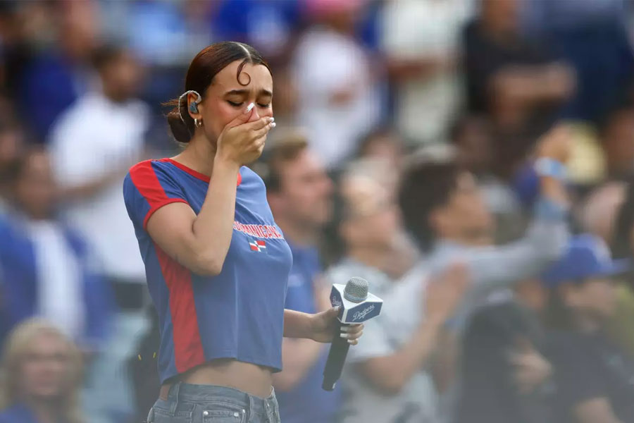 La cantante Nezza llora después de interpretar el Himno Nacional de Estados Unidos antes del juego del sábado 14 de junio de 2025, entre los Dodgers de Los Ángeles y los Gigantes de San Francisco (Foto: AP/Jessie Alcheh/Archivo)
