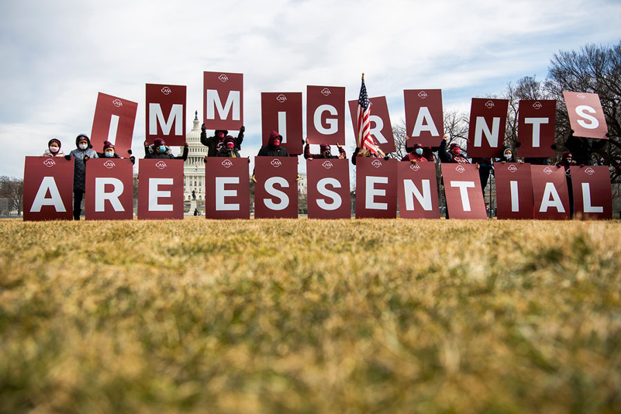 Trabajadores de la industria de alimentos durante una marcha el 17 de febrero en el National Mall, en DC, para destacar las contribuciones de los inmigrantes durante la pandemia y pedir que el Congreso apruebe un alivio y camino a la ciudadanía para 11 millones de indocumentados. (Foto: Tom Williams / CQ-Roll Call, Inc via Getty Images)